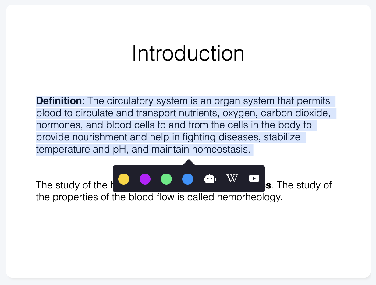 To highlight items in your notes, simply select the text and click on the highlighter icon in the editor. You can then choose the color of your choice.