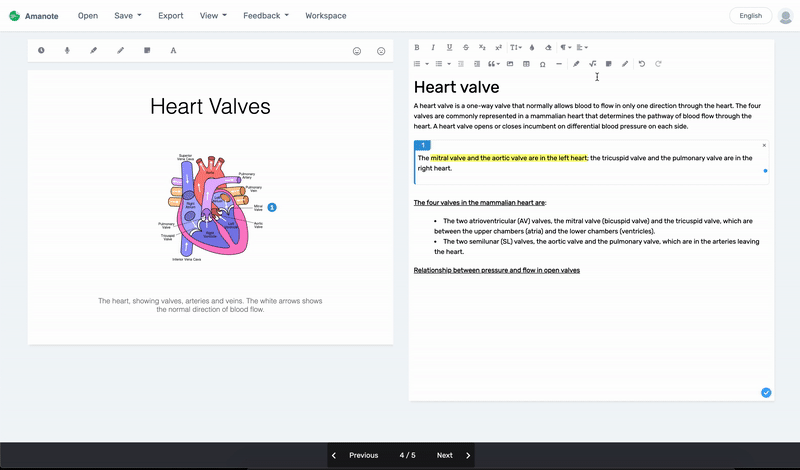 Amanote has no LaTex-compatible mathematical equation editor. To insert a formula, click on the mathematical symbol icon in the text editor. You can then either write the formula directly in LaTex, or build your equation using the equation editor.