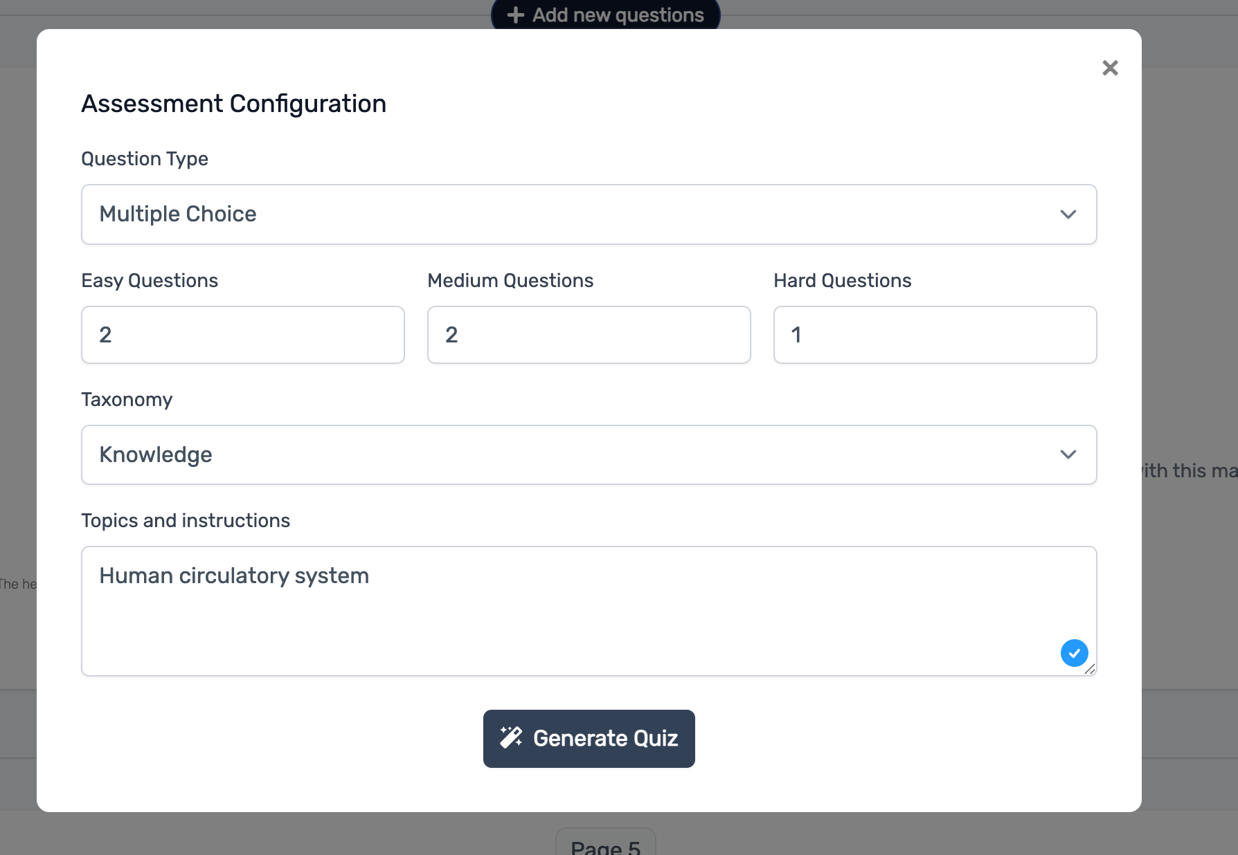 5. A questo punto puoi selezionare il tipo di domanda, il numero di domande e la tassonomia per guidare l’AI nella generazione di quesiti che rispondano a diversi obiettivi di apprendimento (conoscenza, comprensione, analisi, ecc.).